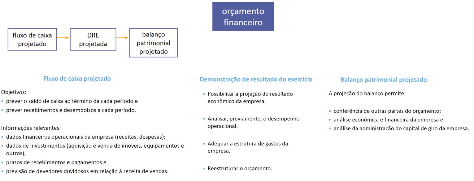 A estrutura do orçamento está dividida em orçamento da receita, dos gastos, dos investimentos e projetos, do fluxo de caixa, da demonstração do resultado e do balanço patrimonial projetados.
