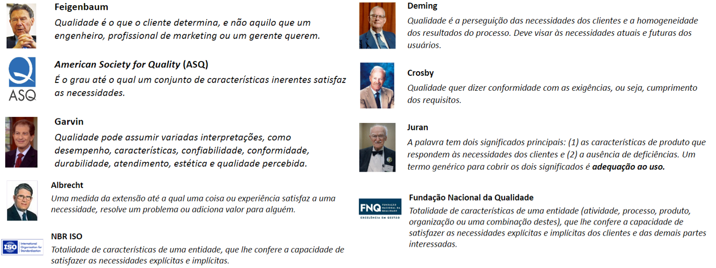 Há uma grande variedade de conceitos e definições da qualidade na literatura especializada e em áreas afins. Segundo Garvin (2002:48), existem cinco abordagens principais para a definição de qualidade: